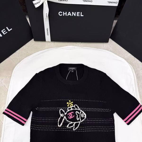 Chanel 2025 Early Spring Small Fish Embroidered Knitted Short-Sleeve Top