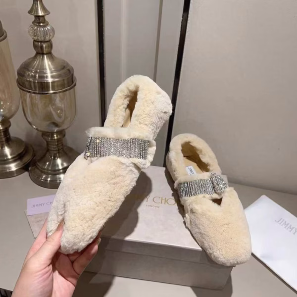 JIMMY CHOO Rabbit Fur Embellished Rhinestone Flat Ballet Shoes