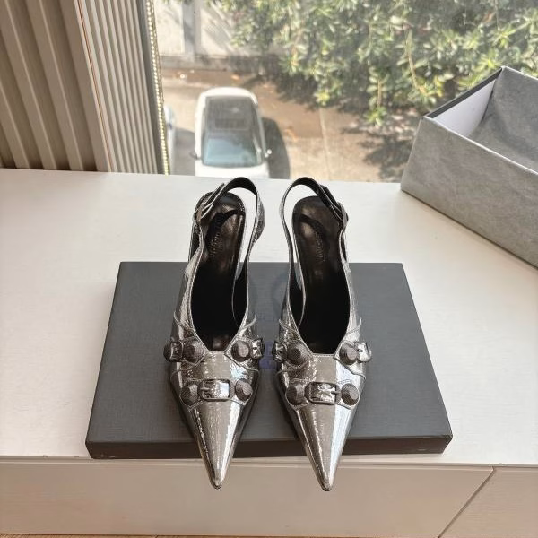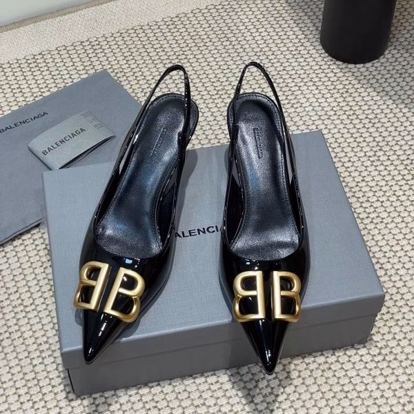 Balenciaga 2025 Spring/Summer New Pointed-Toe BB-Buckle Patent Leather Pumps with Open Back Sandals
