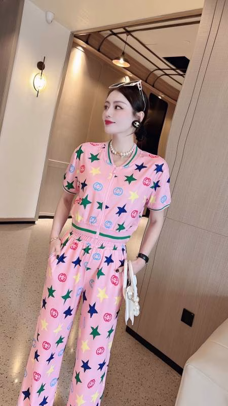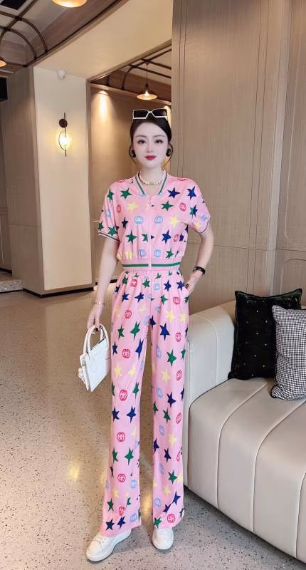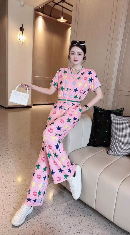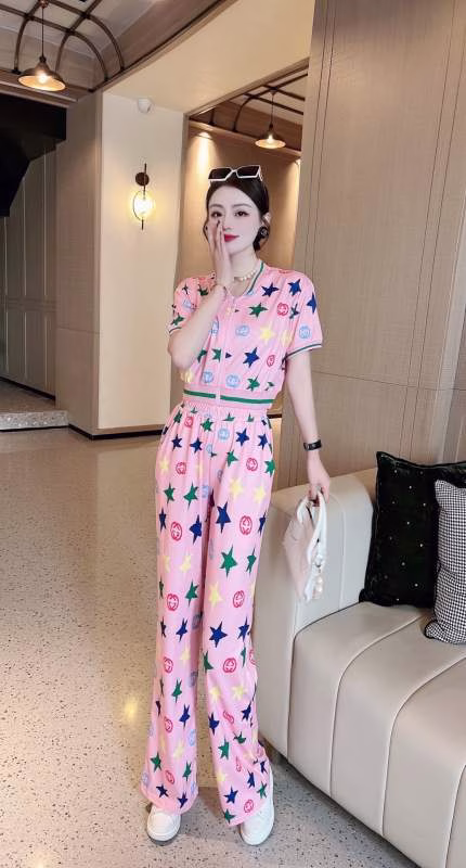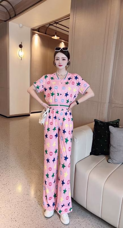 2022 Early Spring Fashion Luxury European Style Gucci Printed Zip-up Waist-cinching Wide-leg Pants & 100% Cotton Short-sleeve Set. It’s the most popular style of the year, with the pictured color restocked constantly. Fabric: 100% cotton. Sizes: S—XL.
