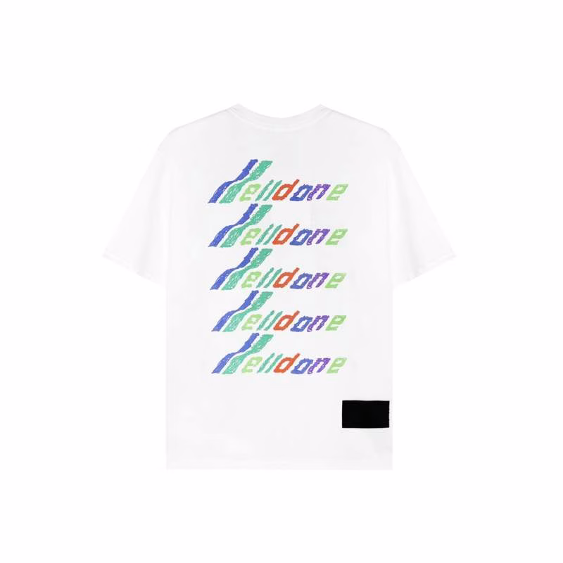2022 Spring/Summer new style colorful spray-painted bullet screen short-sleeve T-shirt. The low-key and calm colors are matched with a loose silhouette cut, making the gender-neutral design obvious. The five rows of letters with the same font adopt hollow spray-painting technology, added with glitter powder coating, and the combination of contrasting colors and fluorescent tones forms the neon outline of multiple rows of letters, which is both beautiful and high-end with quite direct recognition. At the back of the collar, there is a small black silicone label in the shape of “wd” — the abbreviated logo, with the font outlined in white. It embodies both trendy and luxurious styles. The classic WE11 silhouette with infinite unique tailoring, made of 230g double yarn, reaches the custom level!
