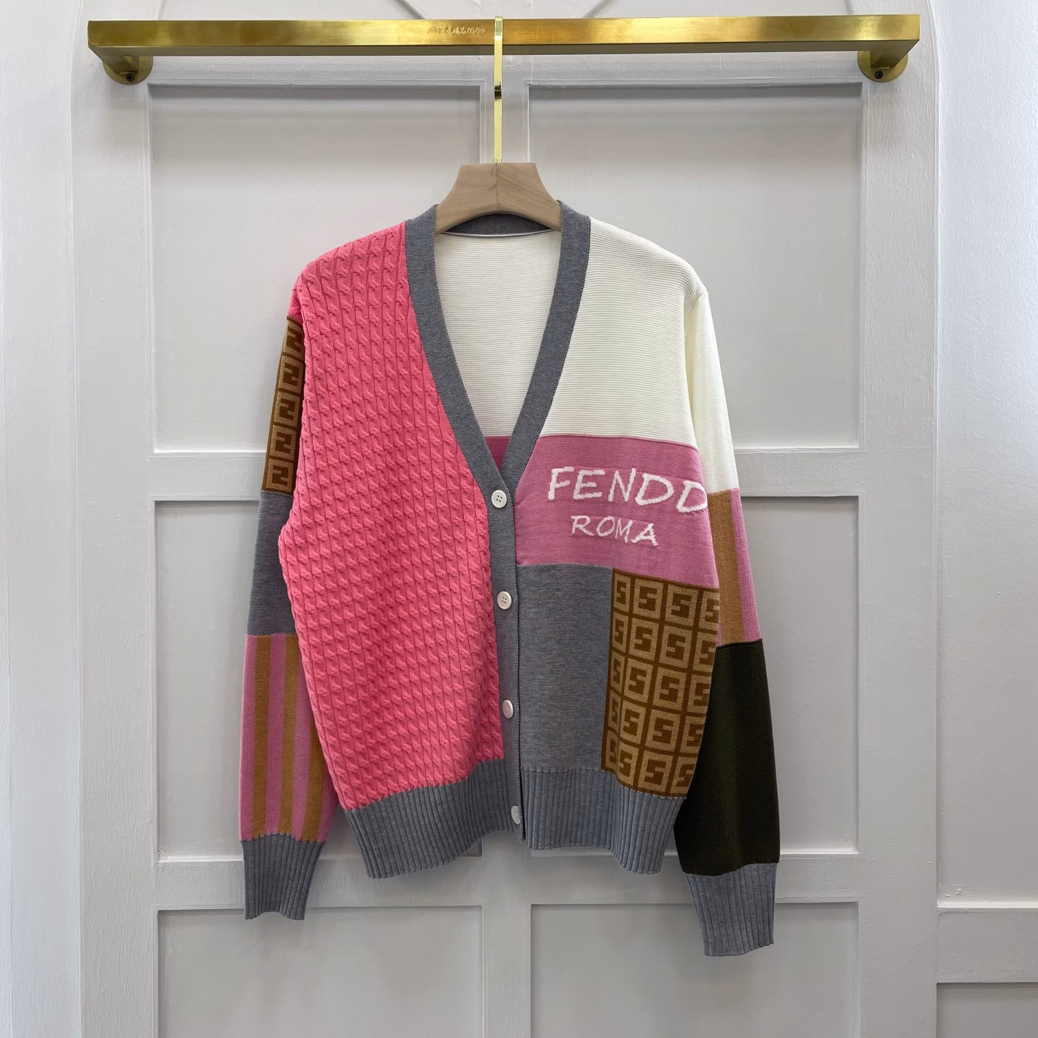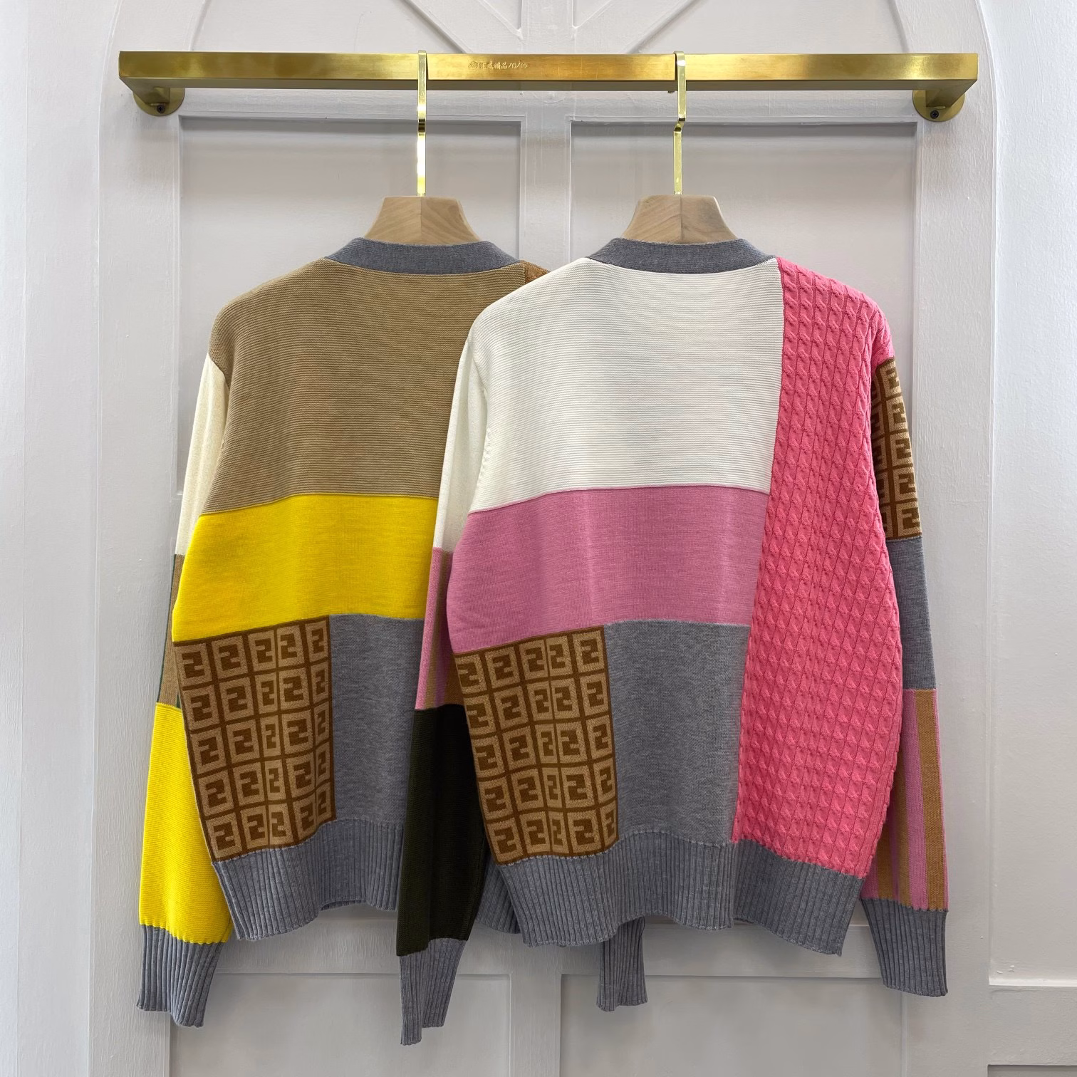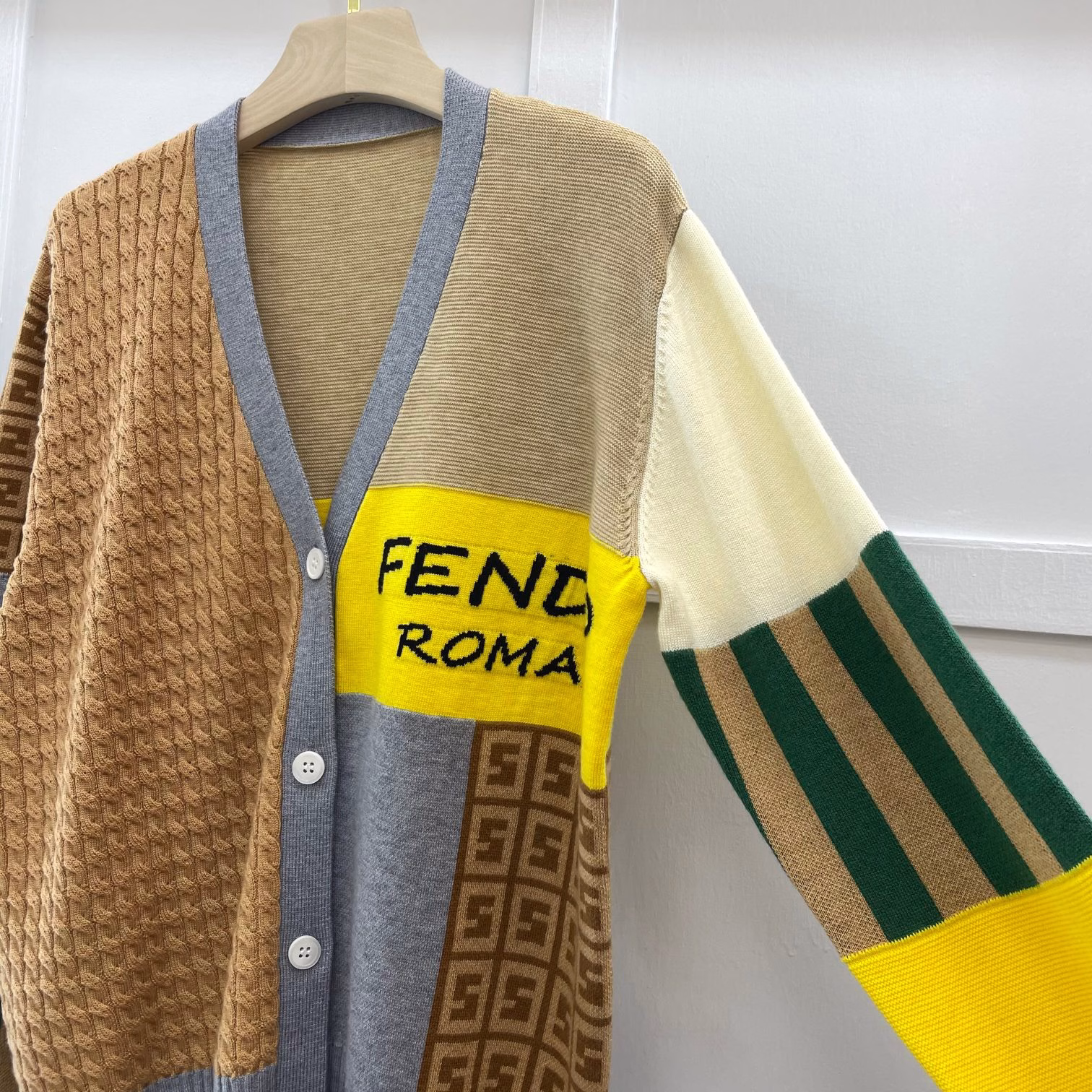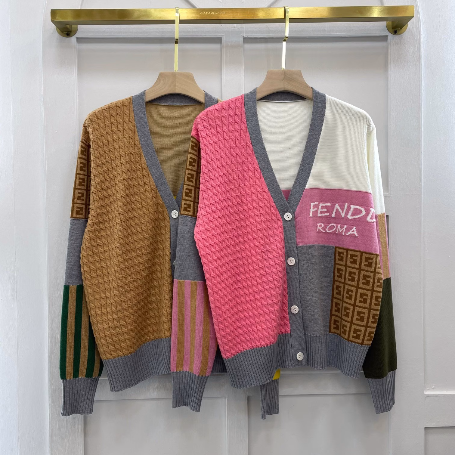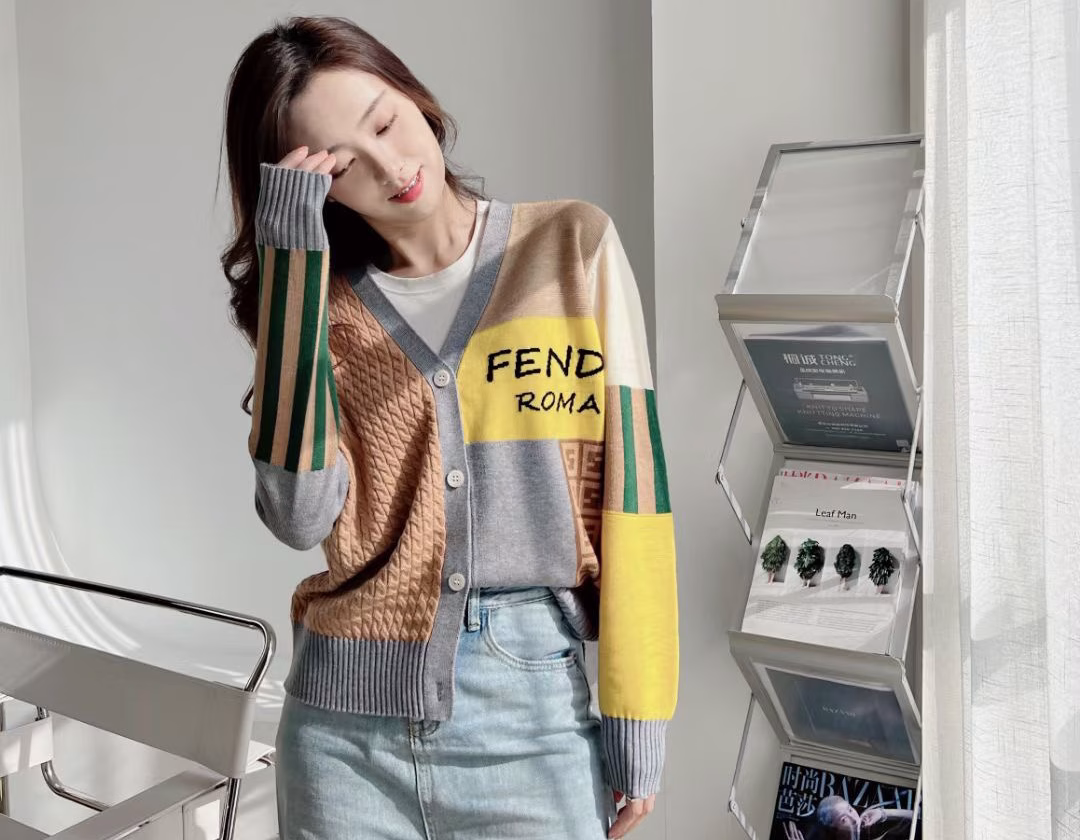 The new Fendi Spring/Summer 2022 styles are now available! Style number: e12006. It’s a fashionable and trendy color-blocked V-neck knitted cardigan with cable knit on one side and color-blocked letters on the other. Fashionable and versatile, it adopts a slightly loose fit, making the wearer look casual, age-reducing and playful. Colors available in bulk: green ~ coffee ~ one size fits all. Material: wool blend. Size M measurements in bulk: shoulder width 45cm, bust 98cm, sleeve length 61cm, garment length 59cm.