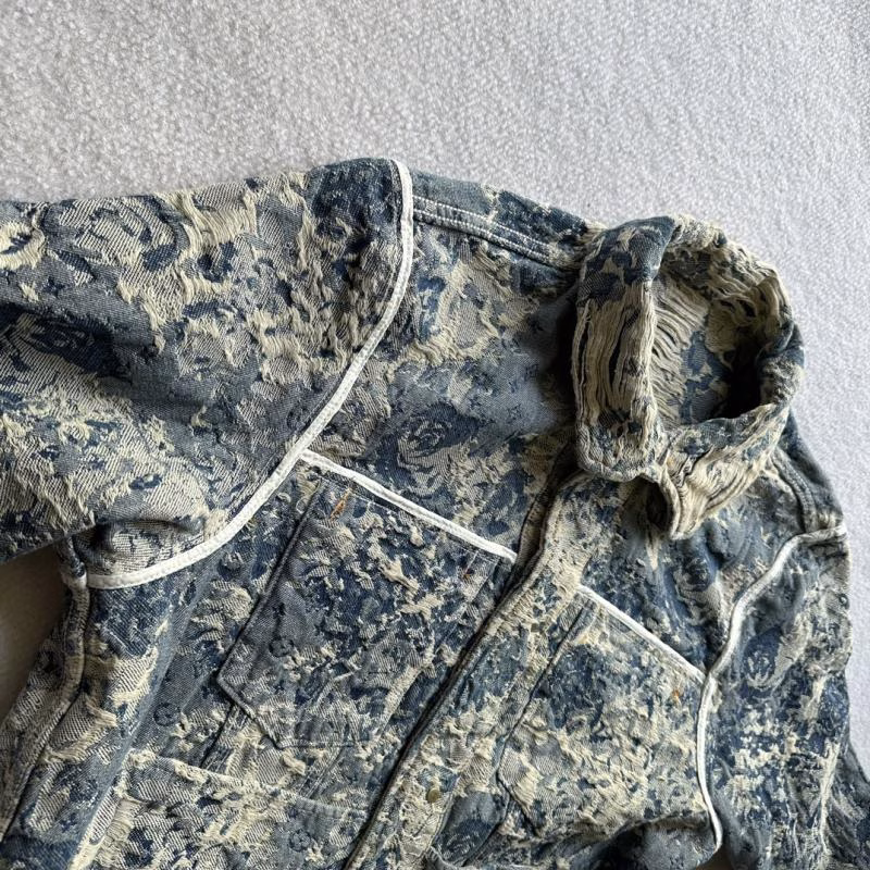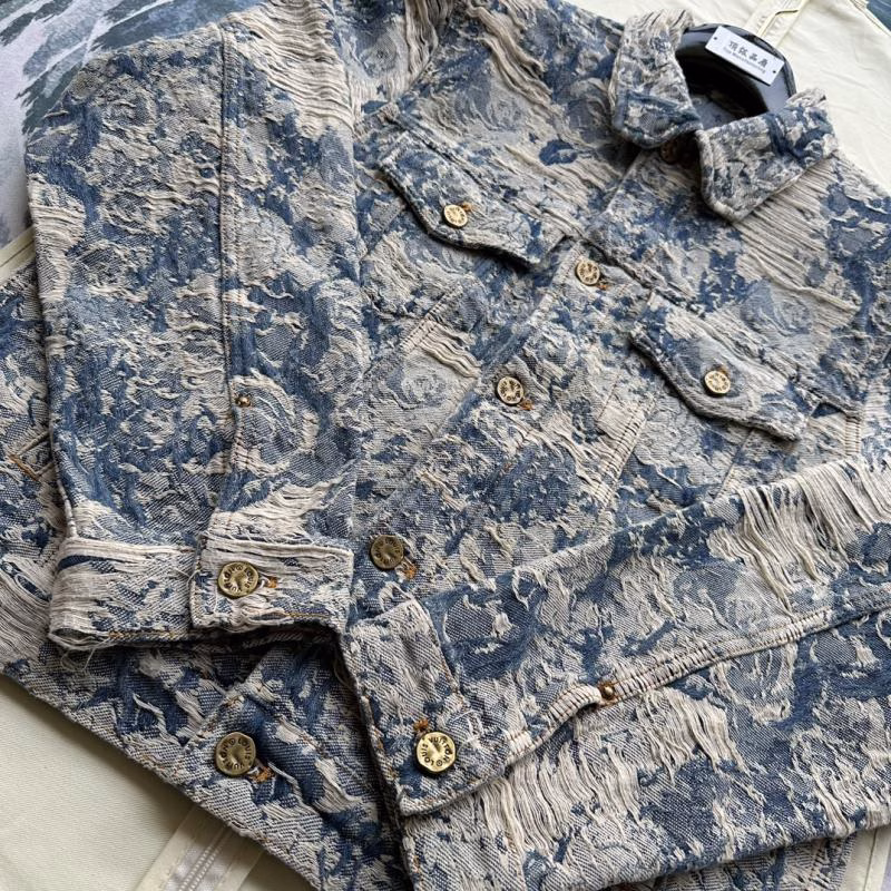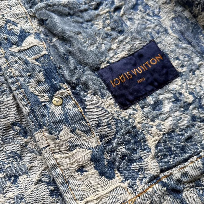 This 2023 Louis Vuitton LV Distressed Floral Rose Jacquard Heavy-Wash Fringed Denim Jacket is one of Louis Vuitton’s most design-oriented denim jackets of 2023. It combines the classic LV Monogram design with abstract rose patterns, and undergoes exquisite craftsmanship such as fringing, brushing, and distressing techniques to highlight a unique sense of fashion. This jacket can be customized through DIY to showcase personalized style, making it a unique choice in your wardrobe.