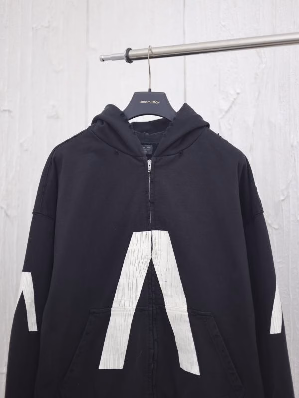 Balenciaga Inverted V Explosive Letter Hoodie, with fashion-forward and rebellious design at its core, is patterned after the original version purchased, highly restoring the brand’s classic style. The hoodie is made of 480g heavyweight pure cotton, offering comfort and durability. The heather gray color is custom-dyed with imported dyes and undergoes multiple light test comparisons to ensure precise color restoration. The letter prints adopt imported cracked rubber paste, creating unique cracked textures through screen printing, which adds a sense of visual layering. The front is designed with a classic kangaroo pocket and an antique silver zipper closure. Deliberately treated destructive designs and irregular hole details in certain parts highlight a rebellious and trendy personality.