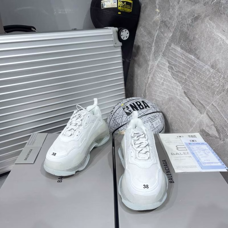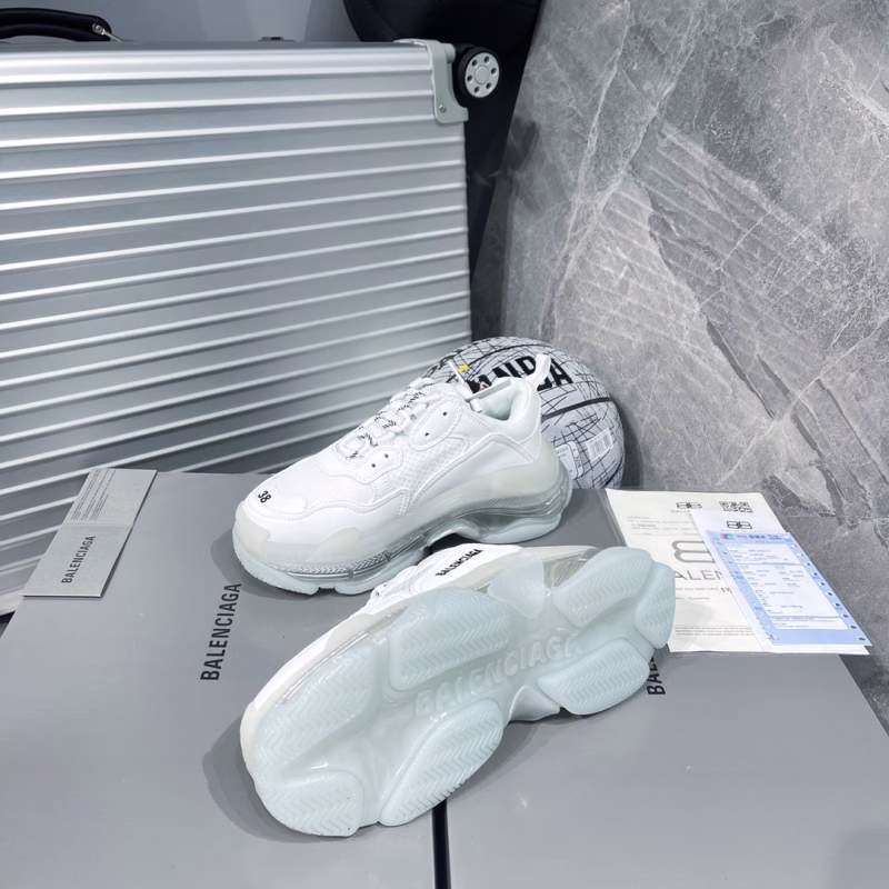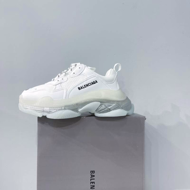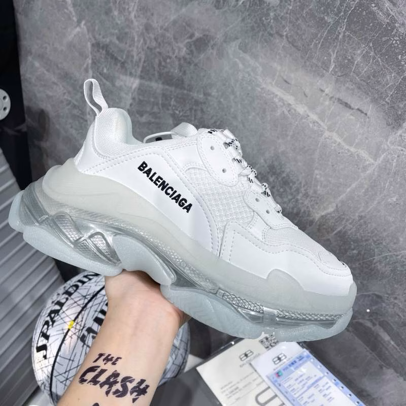 Balenciaga Triple-S – Dad Shoes. The most popular retro jogging shoes worldwide. With retro distressing craftsmanship ~ original combined air-cushioned outsole, featuring heavy craftsmanship, not the low-end two-layer combined sole! The upper is made of imported parachute fabric spliced with cow suede (24 pieces per foot), different from the ordinary canvas available in the market! The back cover is made of cowhide with high-frequency embossing!