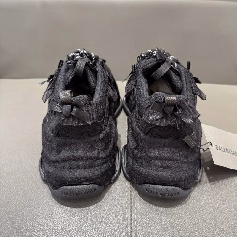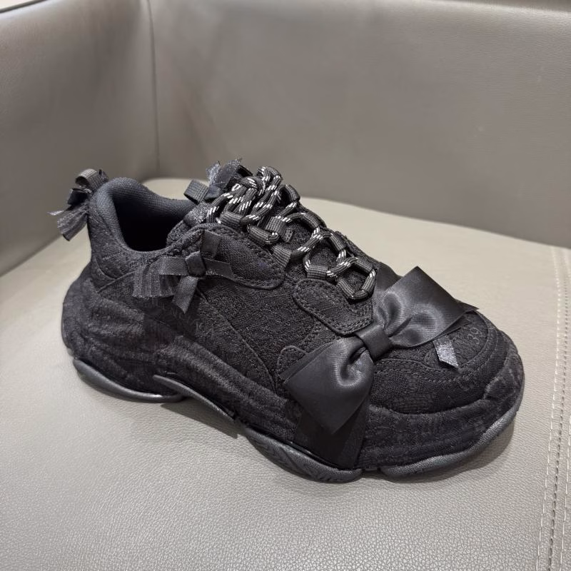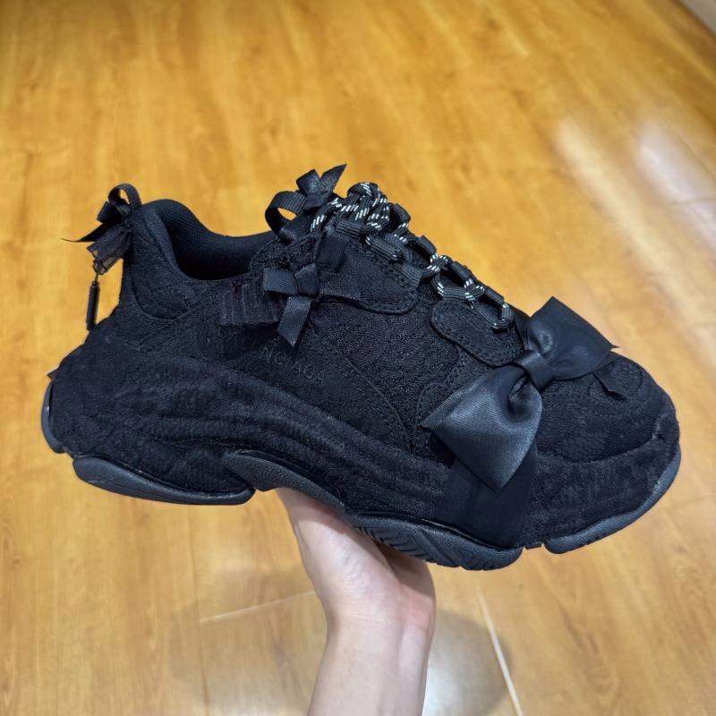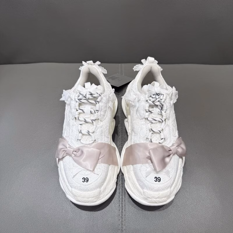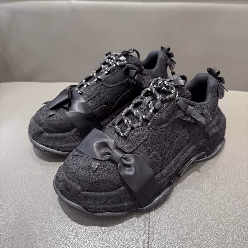 Balenciaga reimagines its iconic Triple S sneakers, blending retro platform design with delicate lace elements to create a bold yet feminine fashion statement. The upper is crafted from nylon and spandex, adorned with romantic bows and lace embellishments—breaking away from traditional sneaker aesthetics to exude distinctive personality and flair.