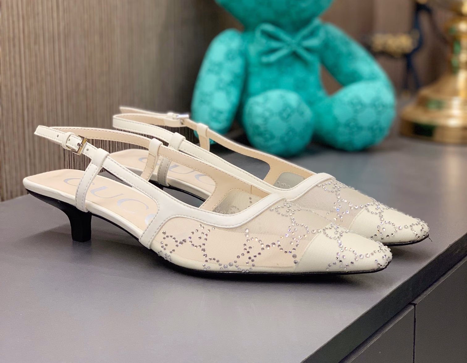 Gucci 2022 Spring/Summer Collection: New counter Vintage-style sandals with rhinestone-embellished uppers, mesh fabric, open-back design, toe coverage, kitten heels, square toes, and hot-selling genuine leather outsoles.