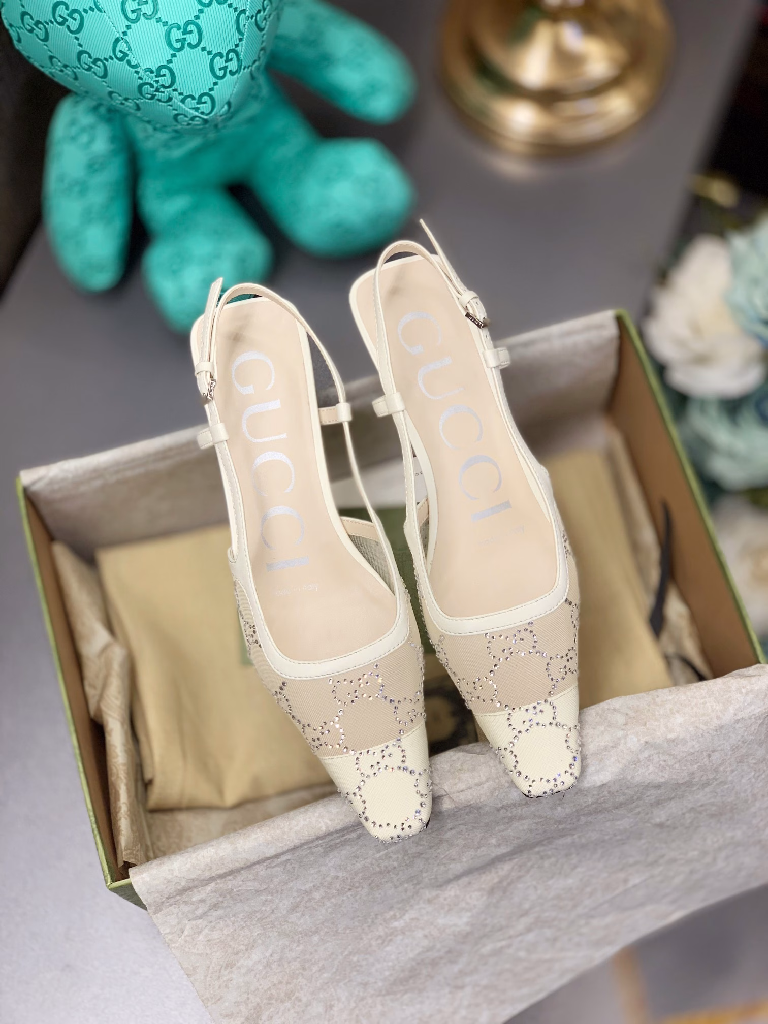 Featuring the iconic GUCCI logo buckle, the sole is inlaid with G-letter rhinestones. As a 100th anniversary commemorative edition, it combines mesh fabric with double G logo heat-pressed rhinestones. It looks gorgeous on feet and is a trendy style that enhances elegance!