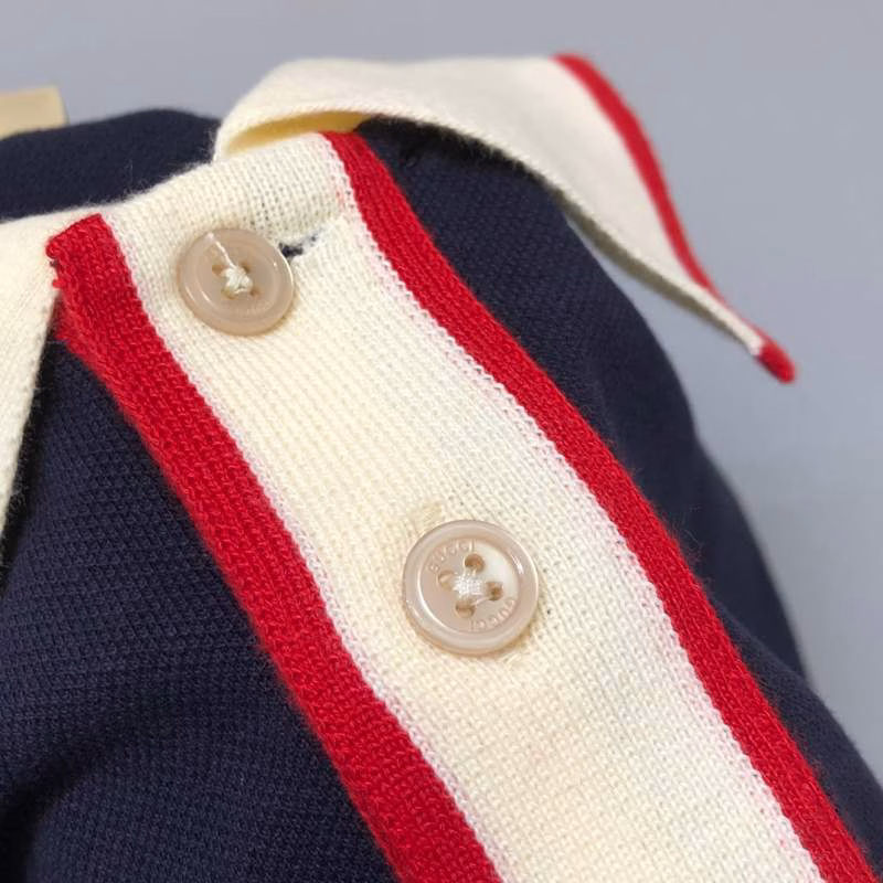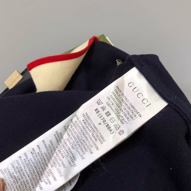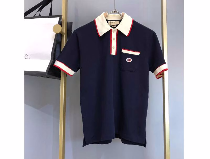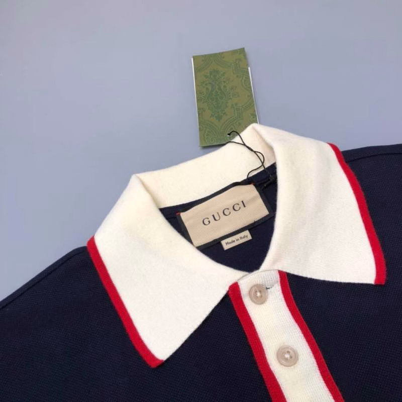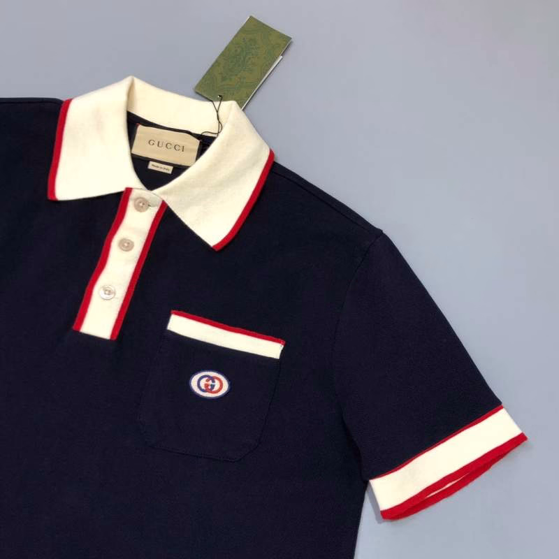 Gucci New Color-Block Polo Shirt with Pocket and Double G Embroidery. The fabric is custom-woven and custom-dyed! The colors are extremely true-to-tone! The color blocking exudes a high-end vibe. The fabric is made of 80s double-strand yarn (25% long-staple cotton + 75% combed cotton) with compact Siro spinning. It’s a single-sided pique cotton fabric, woven into greige cloth on a circular knitting machine. The bulk fabric color is dyed by matching the original version’s color standard. The finished fabric is set with a straight fabric width, retaining the identical honeycomb mesh pique pattern as the original version. The fabric has the silky luster effect of long-staple cotton. The small badge on the front pocket is embroidered with a Barudan embroidery machine. It comes with a matching flying-thread flat-knit rib collar. The placket and cuffs feature color-block pure cotton webbing, all woven with color-fast package-dyed yarns. It is paired with natural white mother-of-pearl buttons engraved with letters.