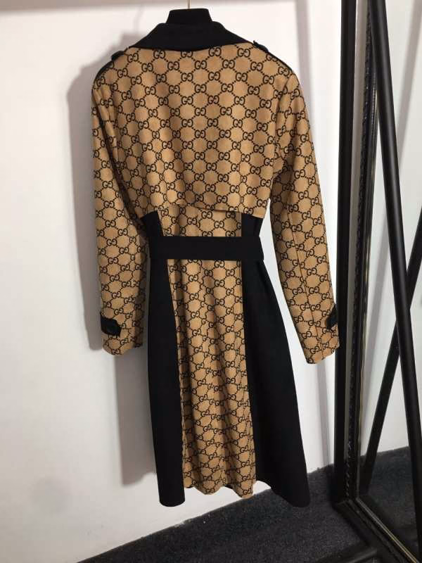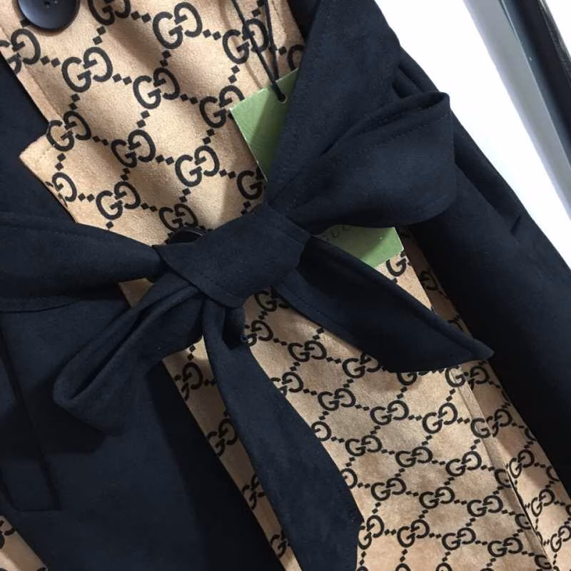 Gucci New Style Double G Letter Print Fashion Color-Block Suede Coat with Tie Waist, Double-Breasted, Lapel Collar and Long-Sleeve Trench Coat, Coffee Color, S/M/L, Size M: Shoulder Width 41, Bust 102, Sleeve Length 60, Total Length 102
