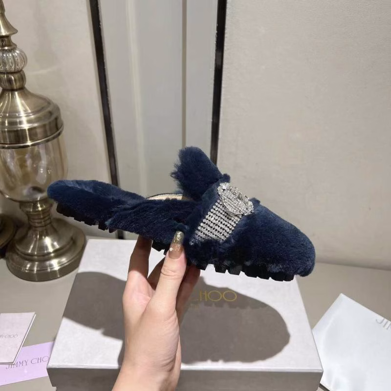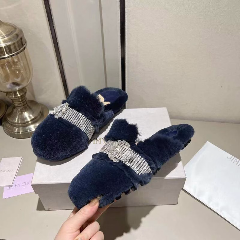 Keywords: Furry slippers, Jimmy Choo, crystal-studded flats, minimalist design, flat shoes