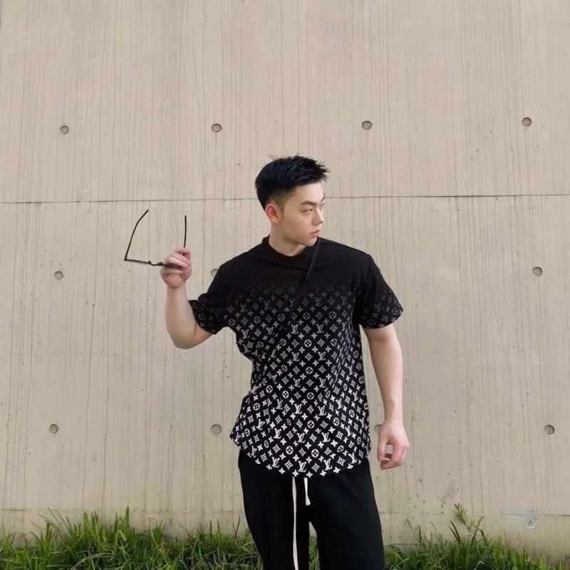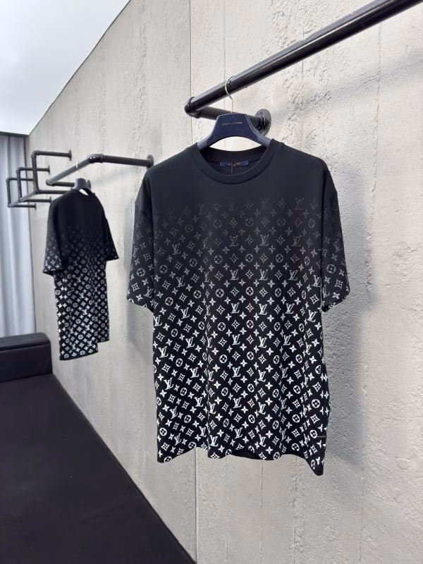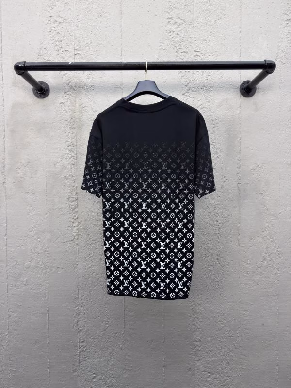 This LOUIS VUITTON short-sleeve T-shirt with all-over print and gradient print at the bottom is made of 230g 32s double-strand combed cotton fabric. The overall design balances comfort and style, ensuring a comfortable and stylish wearing experience. The front and back panels as well as the left and right sleeves of the T-shirt all adopt Konica Minolta white ink digital direct-injection printing, presenting an orderly gradient visual effect and highlighting a sense of fashion. The overall stitching is straight and delicate, the fabric is soft and comfortable, and the color is consistent without any color difference, ensuring quality and comfort. It can be matched with items of the same style, suitable for various occasions. The accessories are carefully customized, with complete three labels, and it is designed as a unisex style.