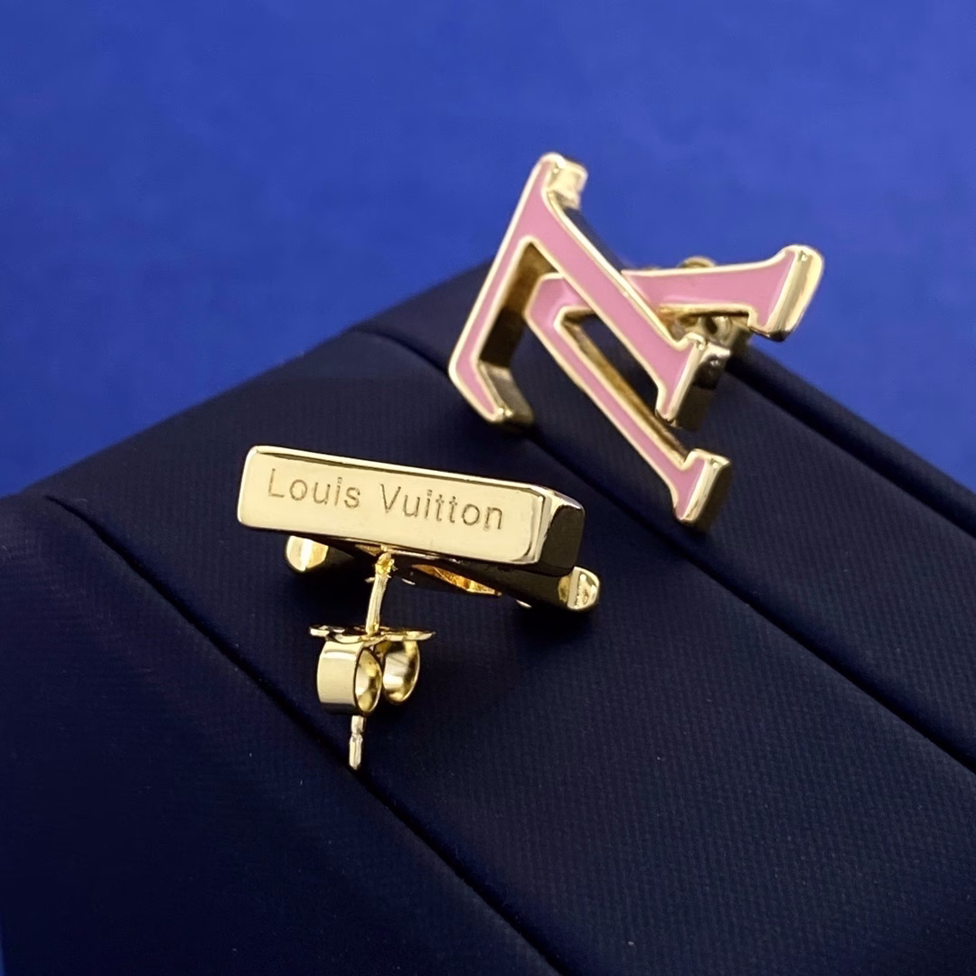 Louis Vuitton gold LV letter logo pink enamel oil drop earrings