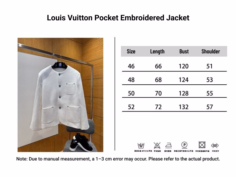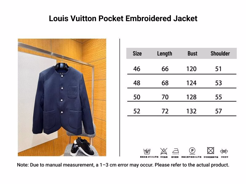 This Louis Vuitton suit jacket is made of custom wool blend fabric, which feels soft and comfortable. It also effectively improves the problems of pure wool being prone to wrinkling and shrinking, combining texture with wearability. The chest pocket is decorated with the brand’s letter embroidery, which is three-dimensional and stylish, subtly showcasing a high-end sense of recognition. The loose silhouette design is suitable for various body types, and the crisp tailoring and just-right drape complement each other, making it suitable for both commuting and daily wear. It is a unisex style, easily creating a fashionable aura.