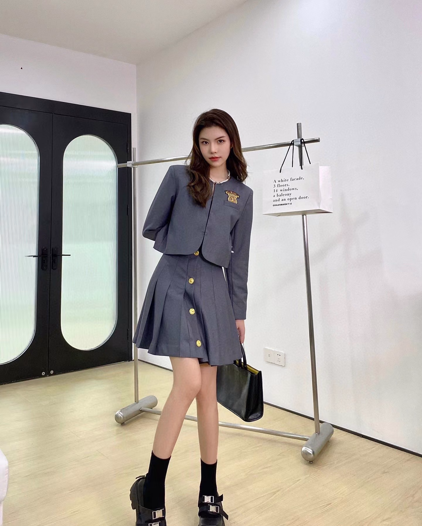 Original order authentic LV new British style smart suit set~ Short round-neck jacket with embroidered logo on the chest, buckle-style placket design (with shoulder pads) + high-waisted slimming A-line pleated skirt with front button design. Color: high-grade gray. Sizes: S/M/L (Size S: shoulder width 38cm, bust 96cm, sleeve length 56cm, jacket length 43cm, high waist circumference 68cm, skirt length 44cm)