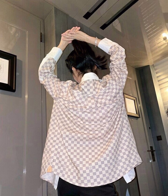Original order authentic LV new early spring limited edition new color checkerboard series letter printed loose long-sleeve shirt, shorter in front and longer at the back, sizes S/M/L (Size S: shoulder width 43cm, front bust 100cm, sleeve length 62cm, garment length 70/77cm)