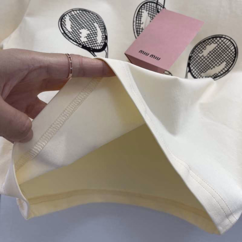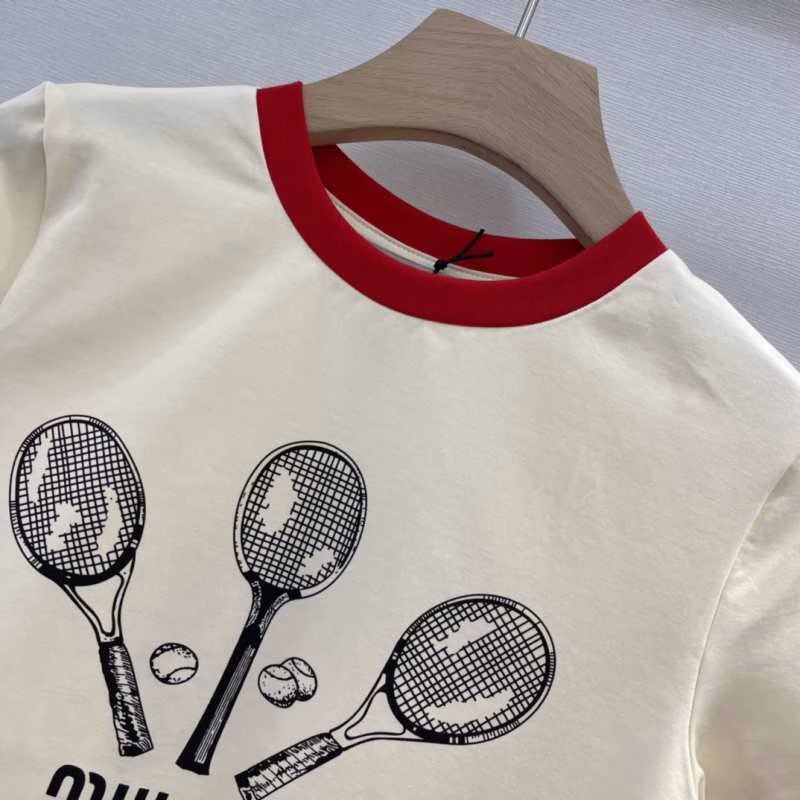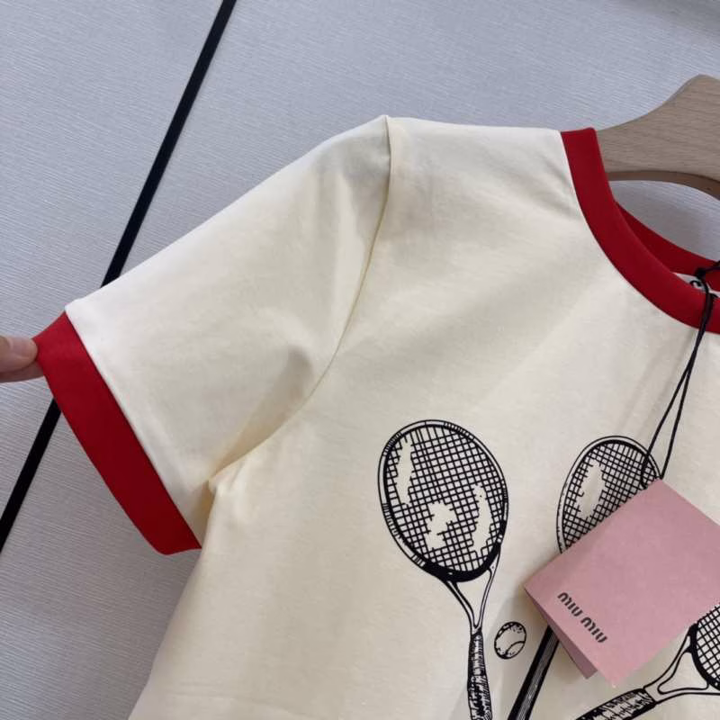 Miu Miu 2022 S/S new style, classic letter color-block short-sleeve T-shirt. The tennis series prints feature a retro and playful vibe. Made of 100% cotton, it has an incredible texture. The short and slim fit looks both sweet and cool when worn, and it can be paired with high-waisted pants or short skirts! Single color.