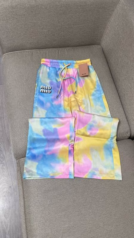 New arrival: original high-end MiuMiu 2022 Spring-Summer latest collection! Tie-dye high-waisted wide-leg pants! Featuring a drawstring waistband, the fit is absolutely amazing—these wide-leg straight-leg pants are both edgy and sleek! Made of original custom plain satin fabric, they feel silky smooth and comfortable. The fresh summer color scheme looks stunning when worn! It’s a chic, handsome and versatile piece, fashionable and high-end, a must-have for elegant and sophisticated ladies! In stock for immediate shipment! Colors available! S-M-L sizes! High-quality bulk goods A706B420C