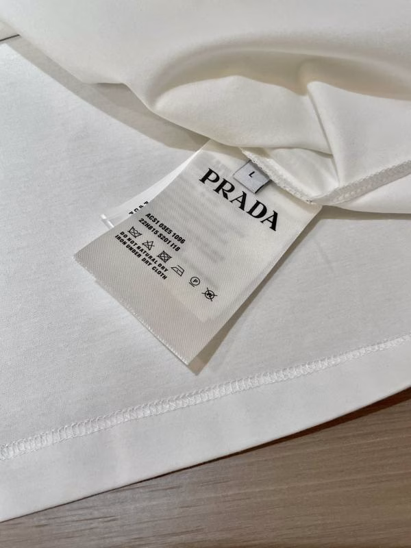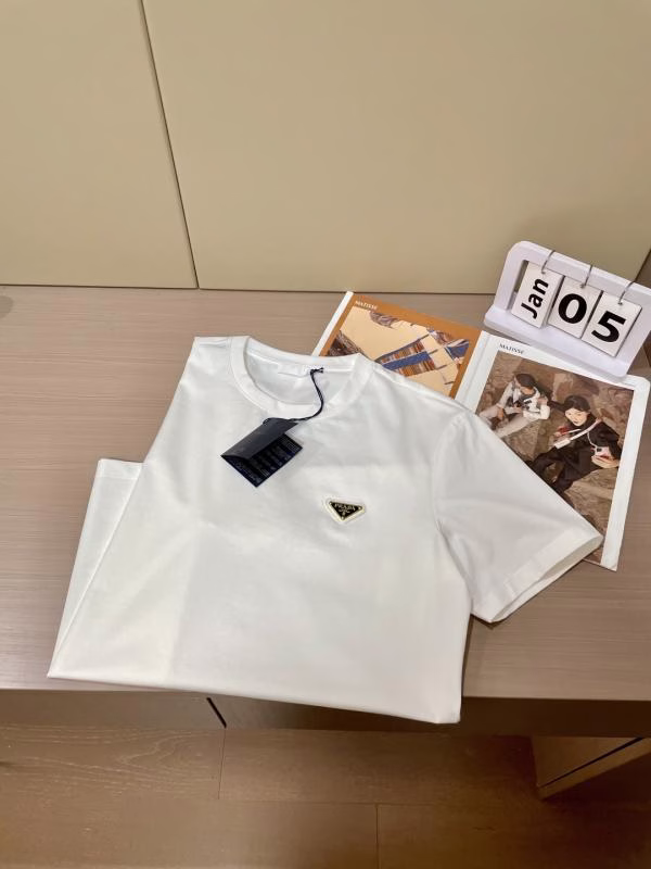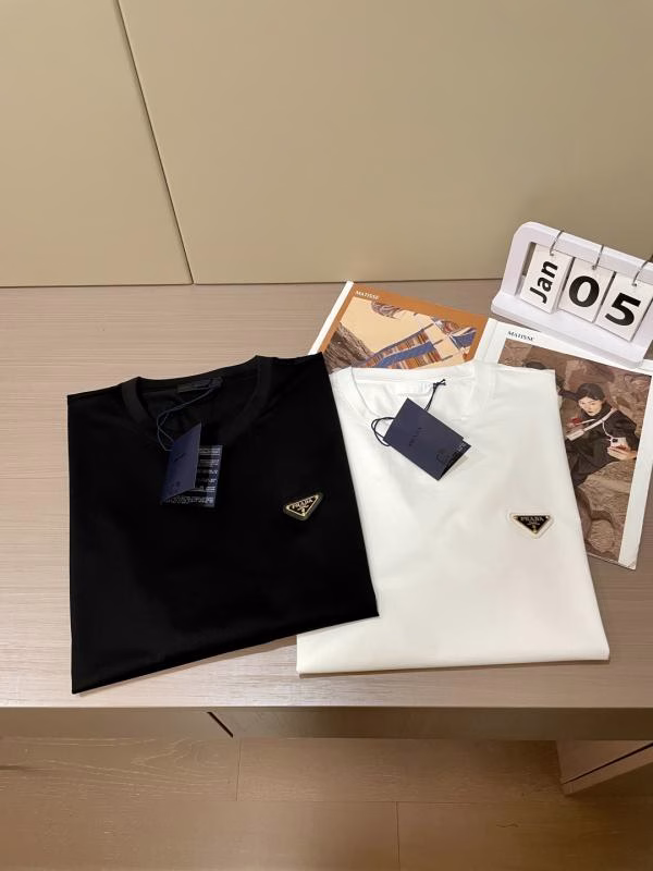 Keywords: Prada short-sleeve T-shirt, enamel-filled metal triangle logo, mercerized long-staple cotton T-shirt, high-end business casual T-shirt, classic luxury T-shirt