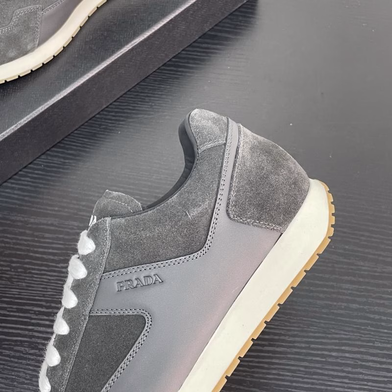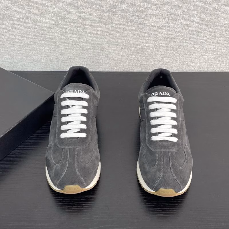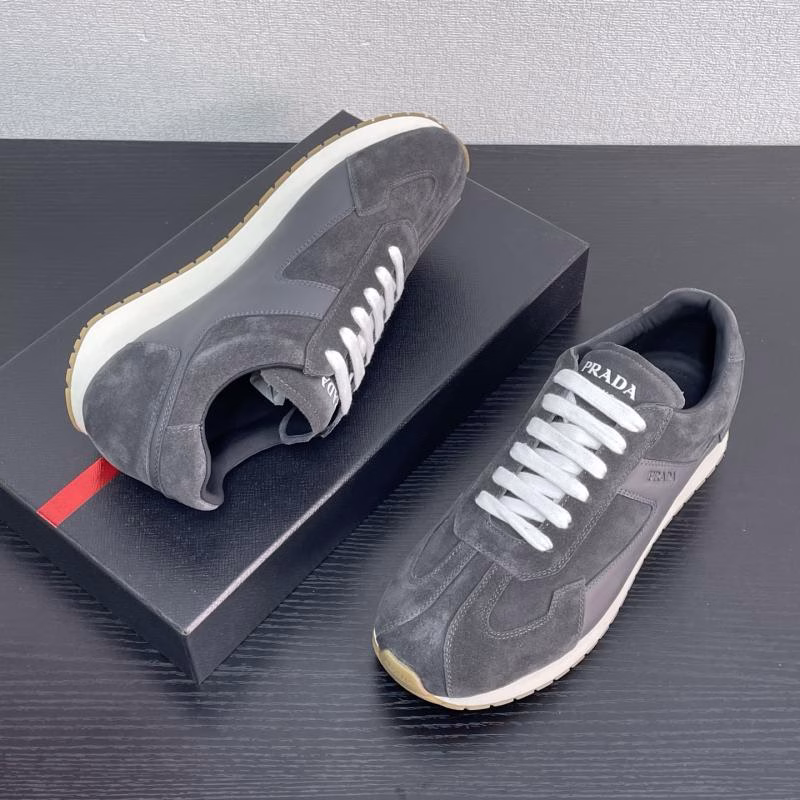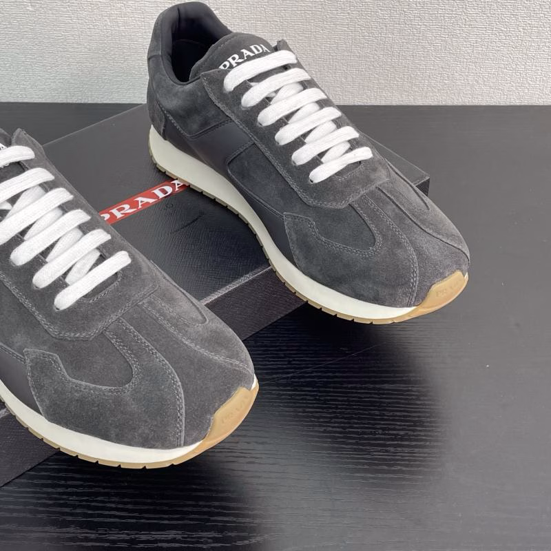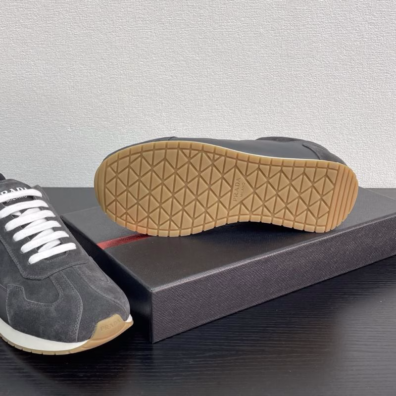 Prada’s new men’s sneakers are meticulously crafted from suede calfskin, blending street trends with luxurious texture. The side of the shoe is adorned with the classic enamel triangular logo, radiating a modern sporty style and enhancing visual recognition. The tongue is embellished with the “Prada Milano” screen-printed logo, further strengthening the brand identity.