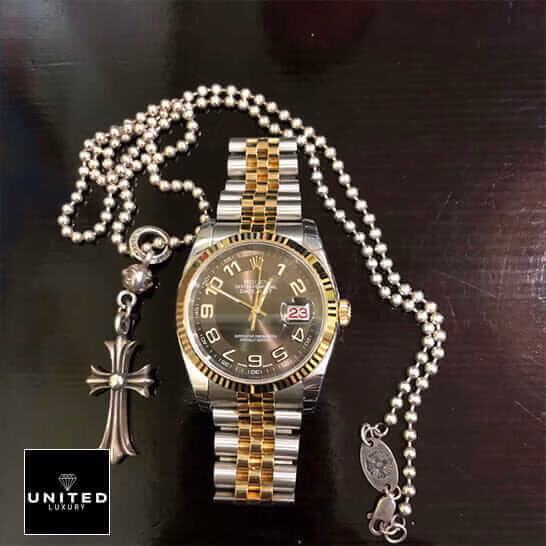 Rolex Datejust Jubilee Bracelet on the wristRolex Datejust Steel Yellow Gold 116233 Replica next to the necklace