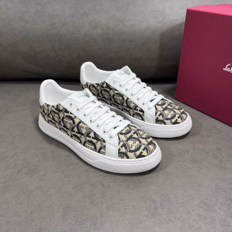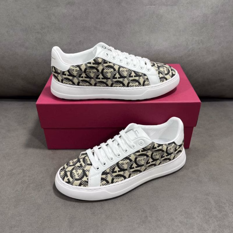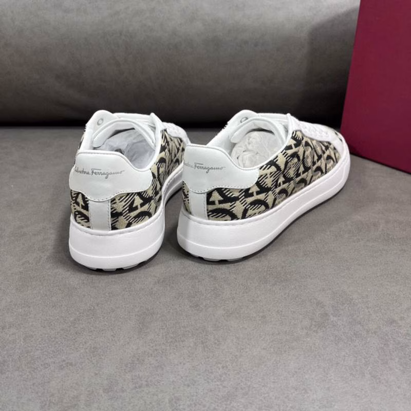 Ferragamo high-end men’s low-top fashion sneakers. This casual shoe features an innovative structure, crafted from soft calfskin spliced with knitted jacquard LOGO fabric. The contrasting color elements on the upper highlight a bold and avant-garde vibe, while the high-tech fabric sock inside the shoe exudes a touch of futuristic charm. Full of vitality and boasting a fresh style, these shoes can not only complement casual outfits but also add a hint of street flair to elegant trousers.