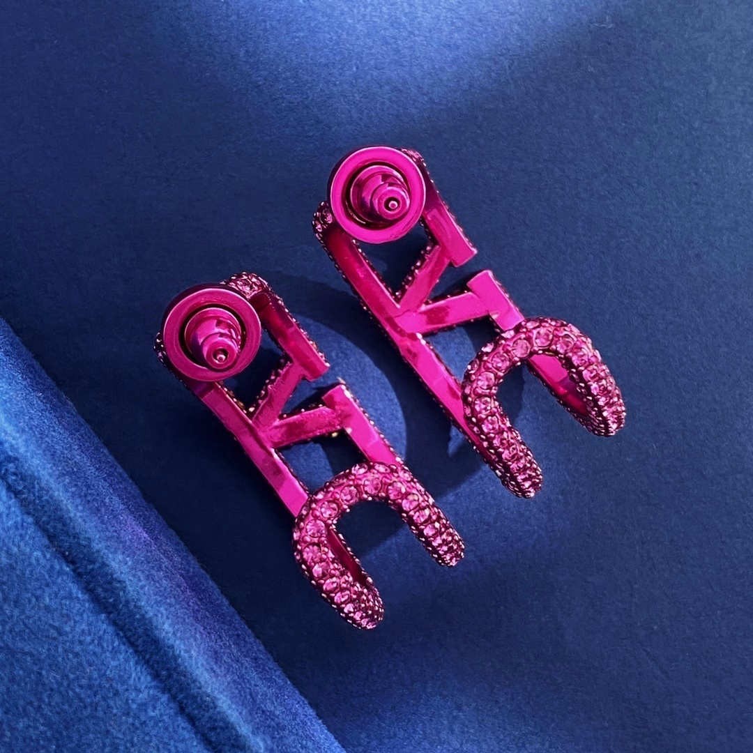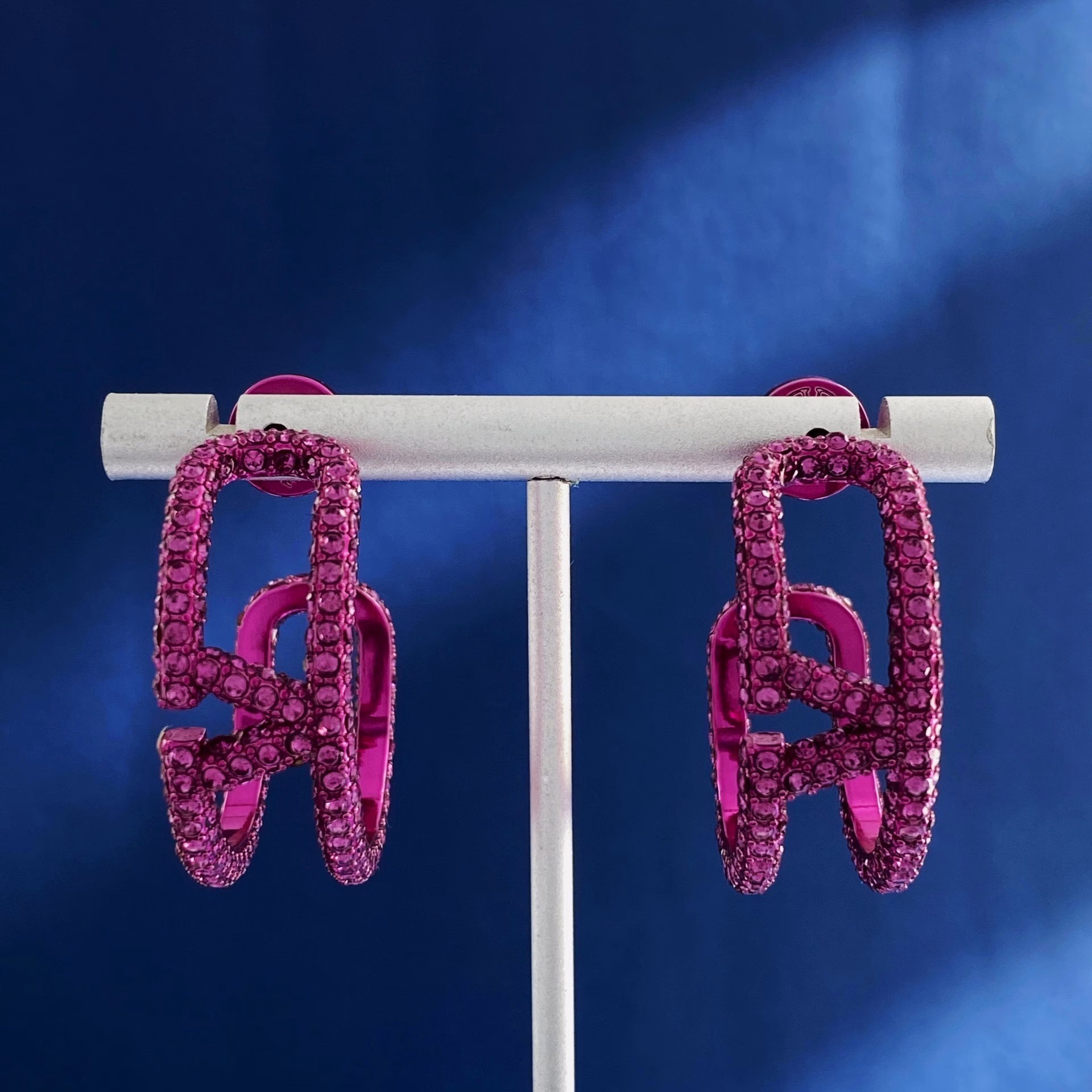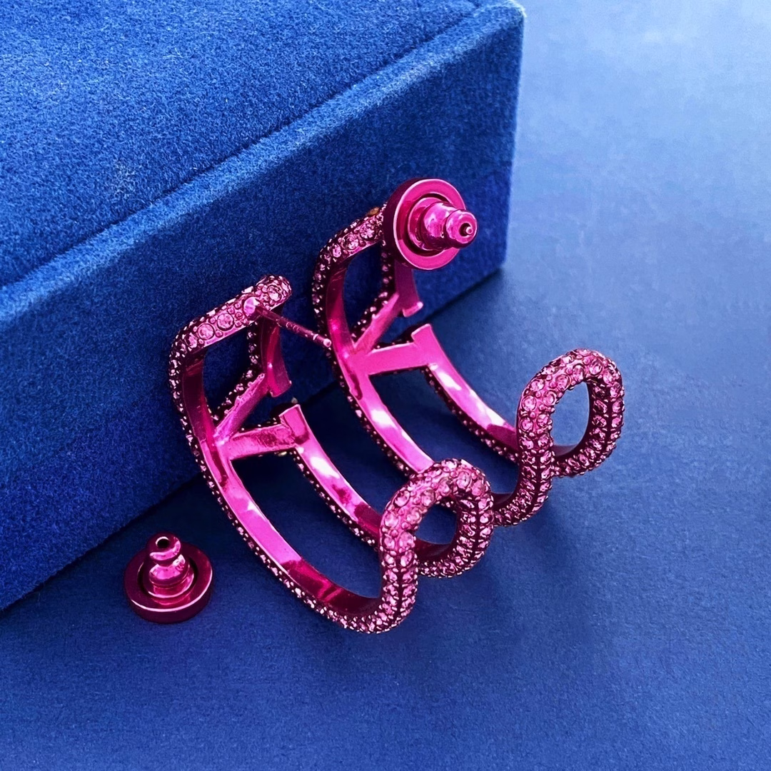 Valentino Pitaya Red Three-Dimensional 3D Circular V Logo Full Diamond Large Earrings, Made of Brass with 18K Gold Plating