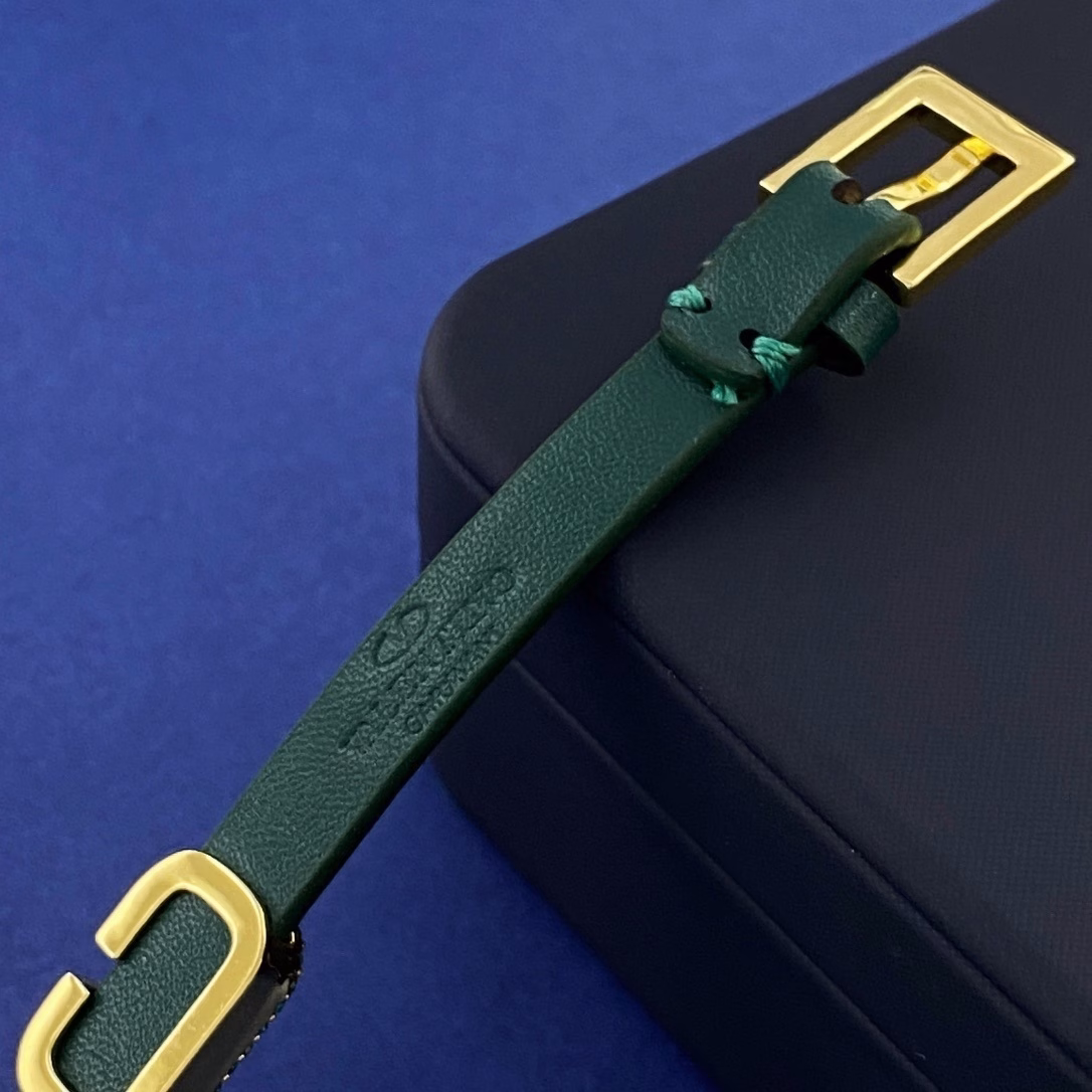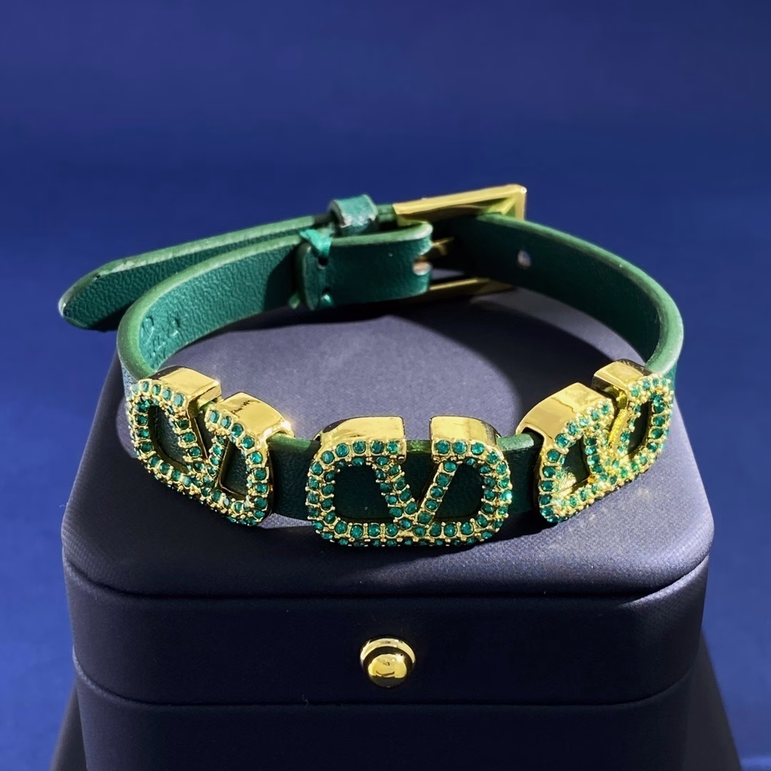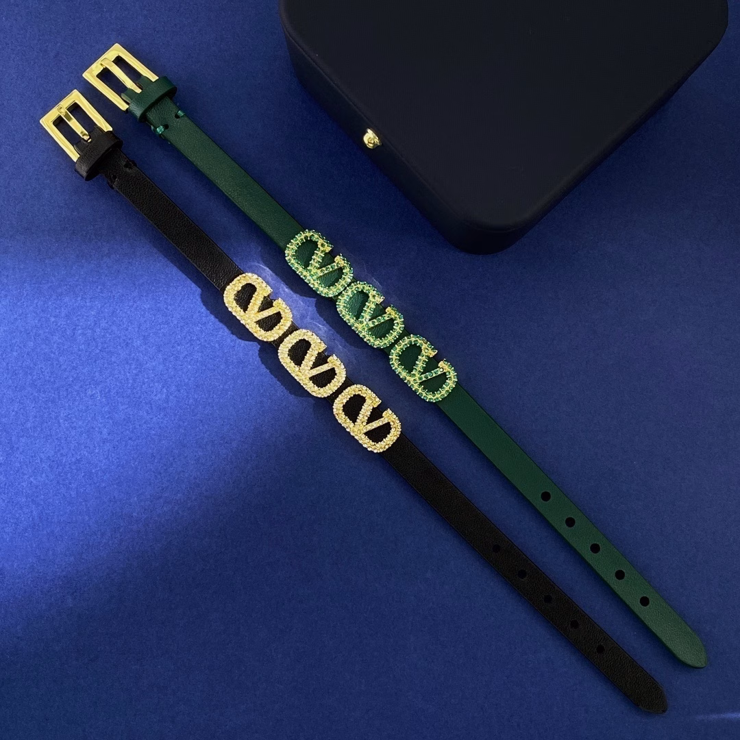 Valentino Three Movable Metal Full-Diamond V-Shaped Logo Hollow Rectangular Logo Eco-Friendly PU Leather Bracelet Colors: Dark Green, Black Materials: Alloy + PU Leather Size: Leather surface width approx. 0.9cm + total length approx. 24.5cm