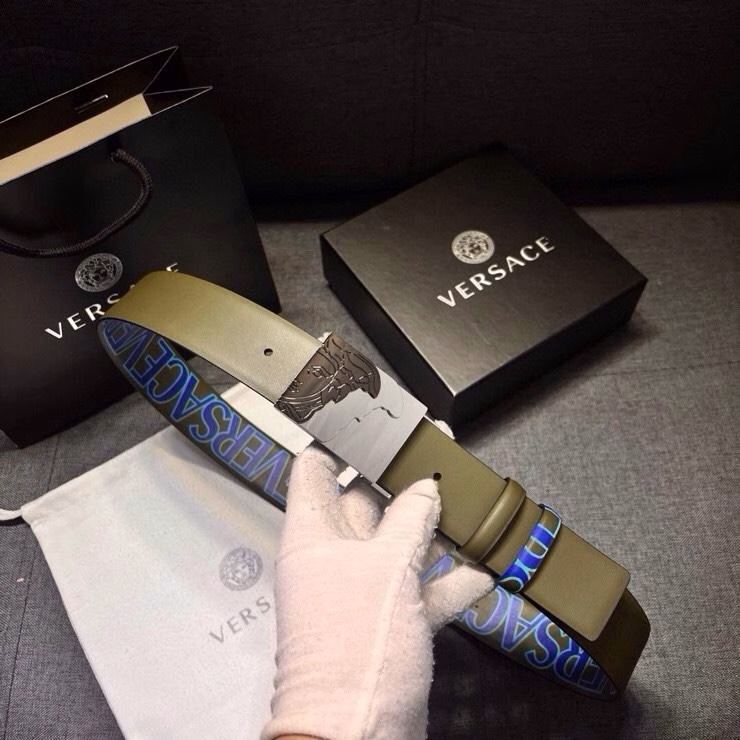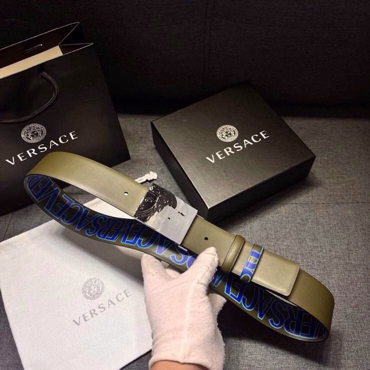 Key Features: Double-sided design, calfskin material, gold buckle, Medusa head, green Versace Allover print
