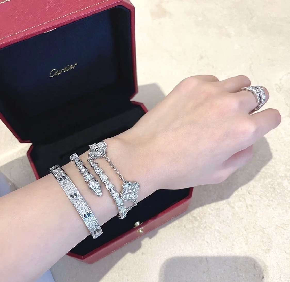 As a classic piece from Bulgari’s iconic Serpenti collection, it draws inspiration from the mysterious and charming serpent, featuring a narrow three-coiled snake bone design that fits the finger shape, exuding exquisite elegance. The ring is fully inlaid with diamonds using a full diamond setting technique, with each coil of the snake’s body adorned with brilliant diamonds. When light shines on it, the diamonds burst with fiery brilliance, perfectly embodying the elegant power of the serpent and the luxurious texture of high-end jewelry.